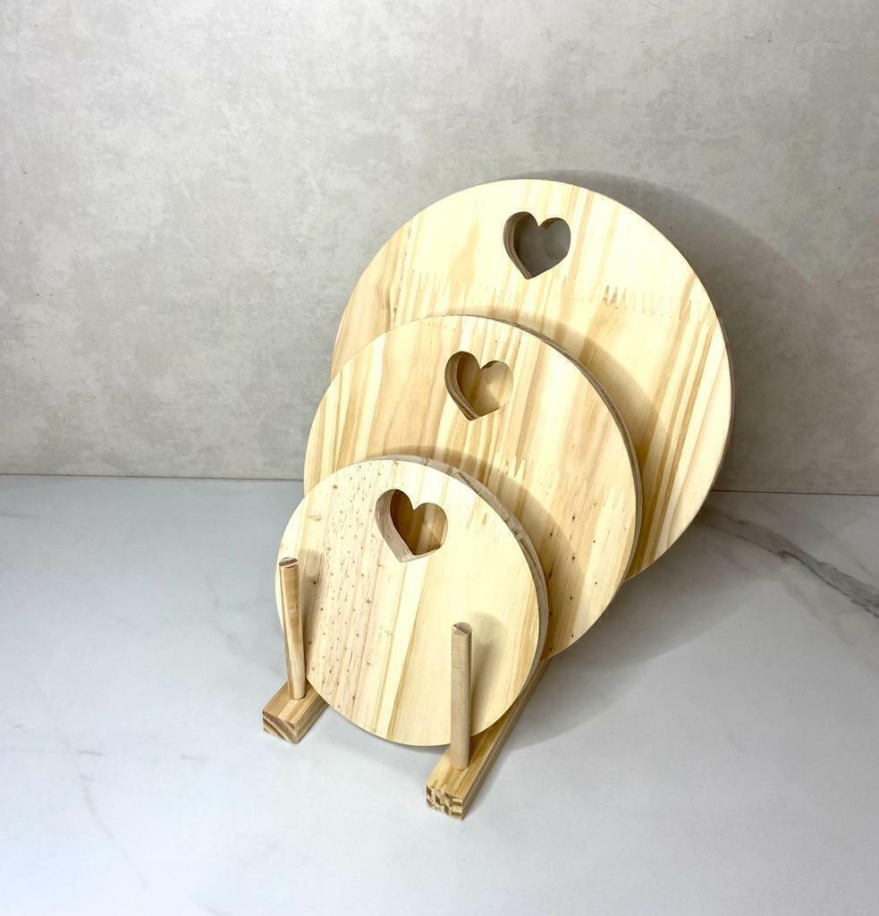 -Trio de Tábuas Redonda com Coração Vazado de madeira Pinus